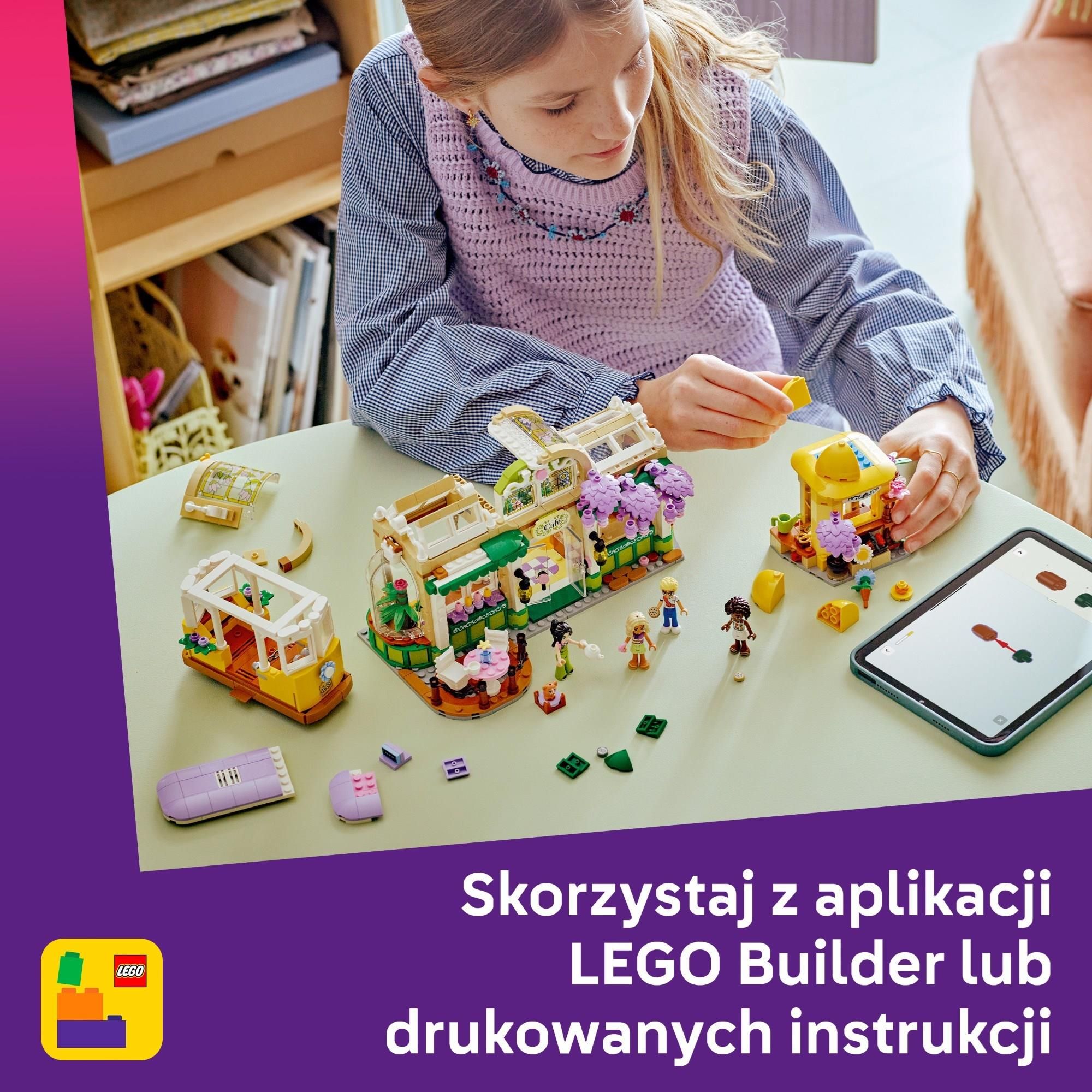 Odkryj piękne kwiaty i rośliny w tym zestawie LEGO Friends. Zestaw przedstawia historię bohaterów: Aliyi, Olly'ego, Novy, Esmy i kota Nuggeta, którzy lubią spotykać się w kawiarni i kiosku z kwiatami. Wiele funkcji inspiruje dzieci do tworzenia kreatywnych historii. Minifigurki mogą jeździć uroczym tramwajem. Przed kawiarnią znajduje się taras. Kuchnia wyposażona jest w lodówkę, piekarnik i ekspres do kawy. W kwiaciarni możesz kupić bukiety i rośliny doniczkowe. Po zakończeniu zabawy możesz wyświetlić model, aby każdego dnia cieszyć się kwiatami.