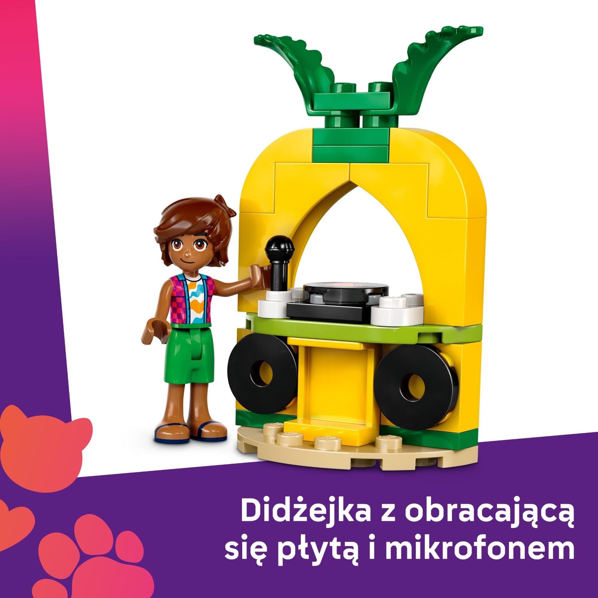 Dzieci mogą wykazać się kreatywnością i odegrać scenę, w której Leo, Liann i Churro bawią się na przyjęciu przy basenie, korzystając ze swoich dmuchanych kółek w kształcie jednorożca i flaminga. Pływająca zabawka w kształcie flaminga z uchwytem na 2 lody na patyku pomieści 2 minifigurki. Mniejsza zabawka do pływania w kształcie jednorożca idealnie nadaje się dla kota Churro, który lubi towarzyszyć tej dwójce. Leżak, kabina DJ-a z obracającą się płytą i mikrofonem, krem do opalania i napój zachęcają do kreatywnej zabawy w odgrywanie ról.