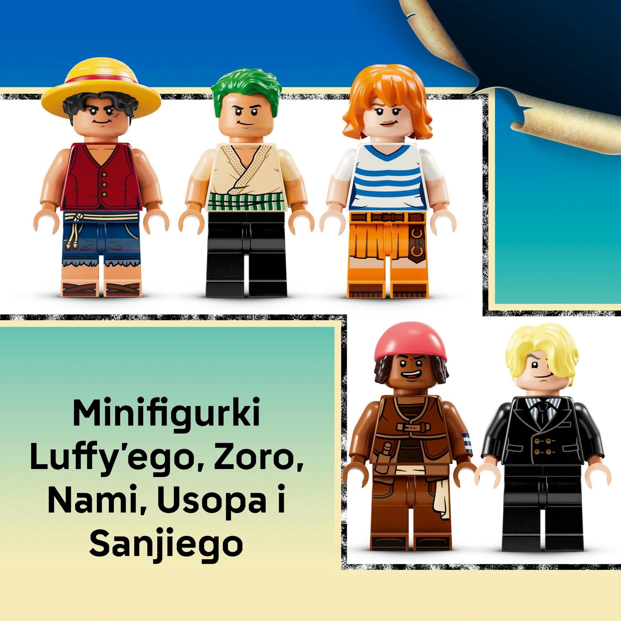 Minifigurki LEGO ONE PIECE: Zestaw zawiera szczegółowe minifigurki Monkey D. Luffy'ego, Zoro, Nami, Usopa i Sanjiego